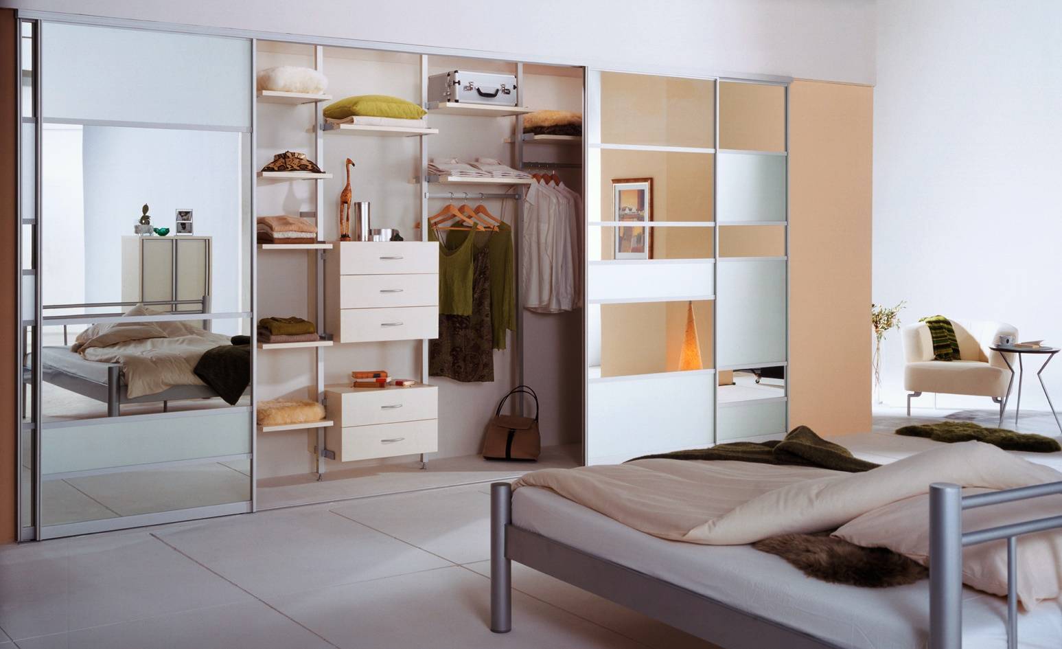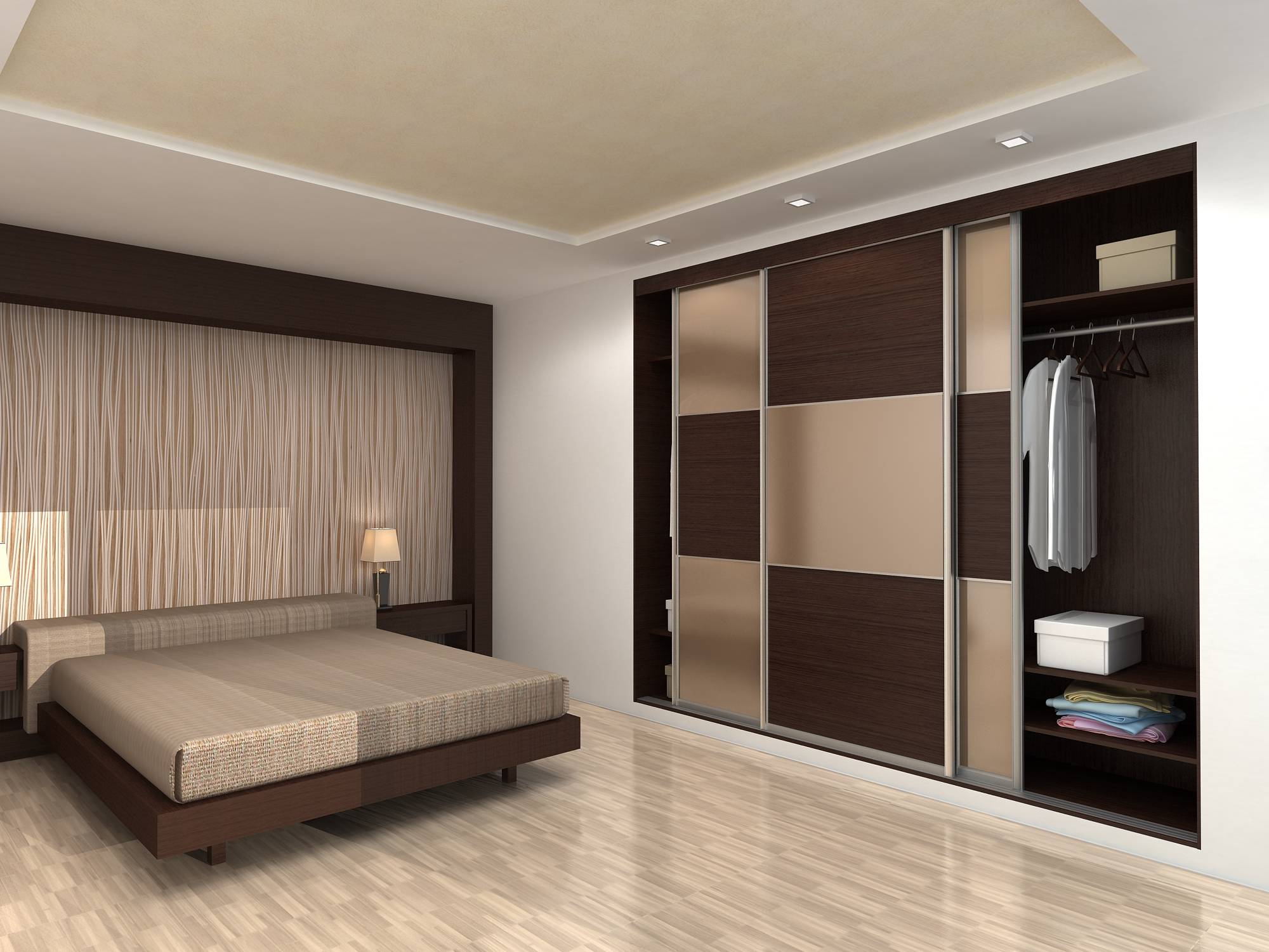 Шкаф-купе, установленный в спальню, удобен для хранения нижнего и постельного белья. Существуют модели, сконструированные для того, чтобы спрятать подъемную кровать. Их отличительные черты: