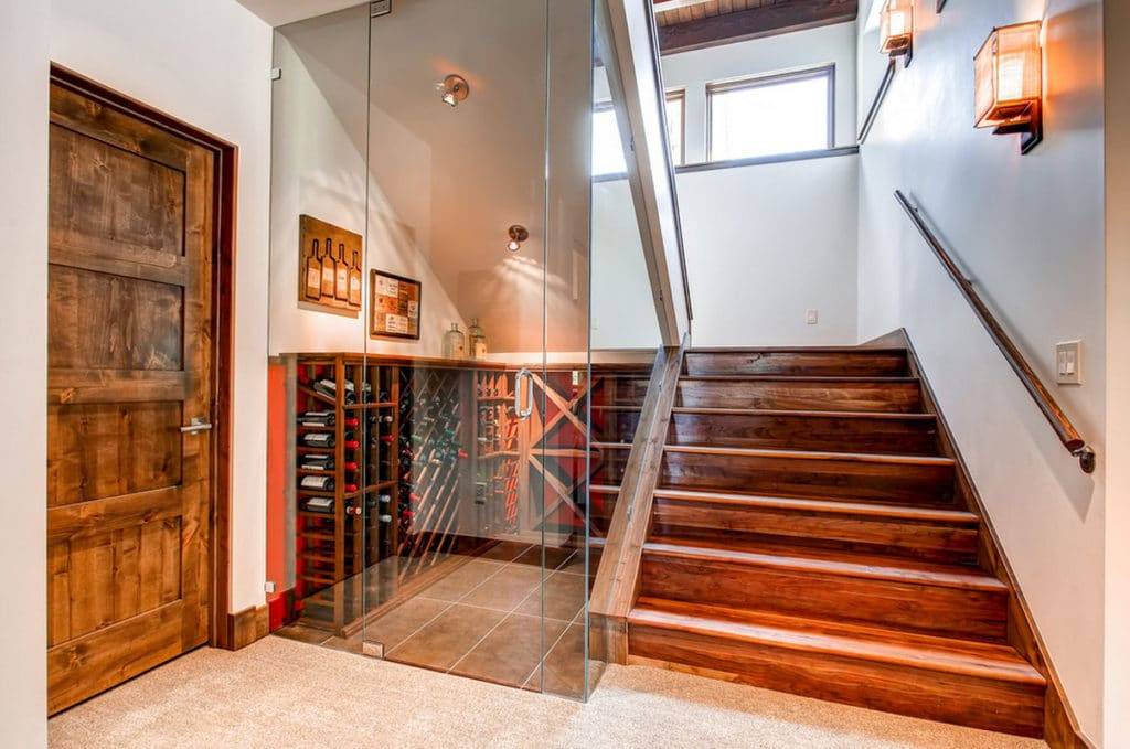 Вариант оформления свободного места под подъёмом на второй этаж с помощью перегородок из стекла используется в жилых помещениях реже. Такая идея позволит зрительно облегчить любую, даже самую тяжёлую конструкцию из ступеней.