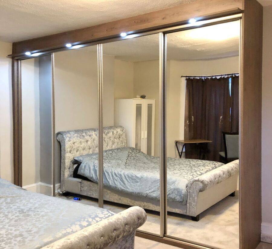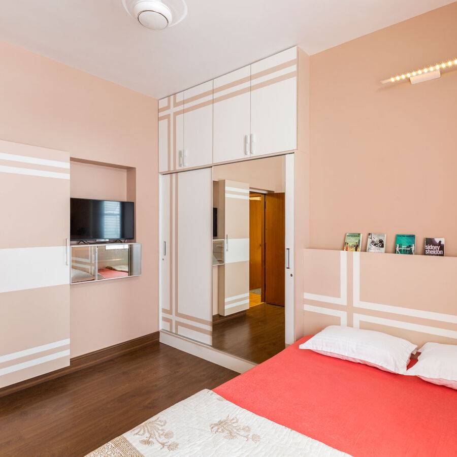 Шкаф-купе в спальне с телевизором размещают вдоль стены, напротив окна. Это позволит приобрести купе большой ширины или спроектировать, задав параметры.
