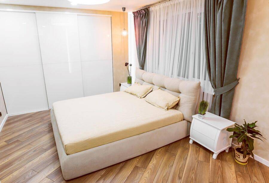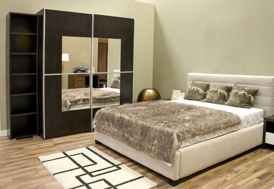 В спальне главное место занимает кровать, которая имеет большую длину и ширину, если это не односпальный вариант. Устанавливают мебель для сна у окна, в центре комнаты, у стены. Вокруг нее размещают прочие предметы.