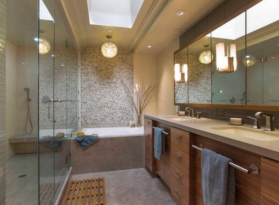 Свет от нее должен быть умеренно ярким. Если вы делаете макияж в ванной, то люстры будет мало, и нужно установить дополнительное освещение возле зеркала. Вся проводка в ванной должна быть хорошо защищена.