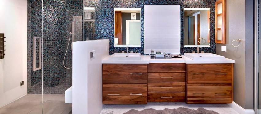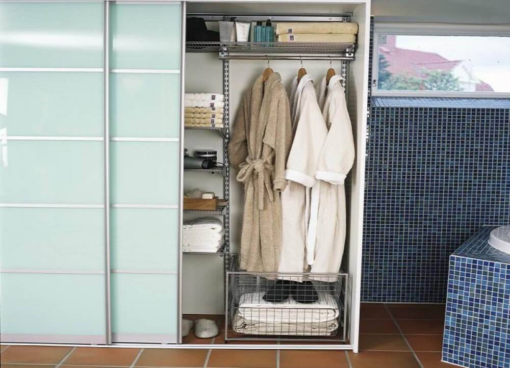 В первую очередь при размещении мебели, нужно учитывать тот момент, что ванный гарнитур не должен контактировать с водой. Материал, из которого изготавливаются шкафы-купе может быть таким: ДСП, МДФ, стеклополотно, пластик, металл применяются для раздвижных панелей. Они не деформируются во влажной среде, не подвергаются коррозии.