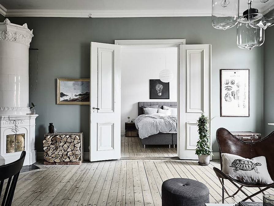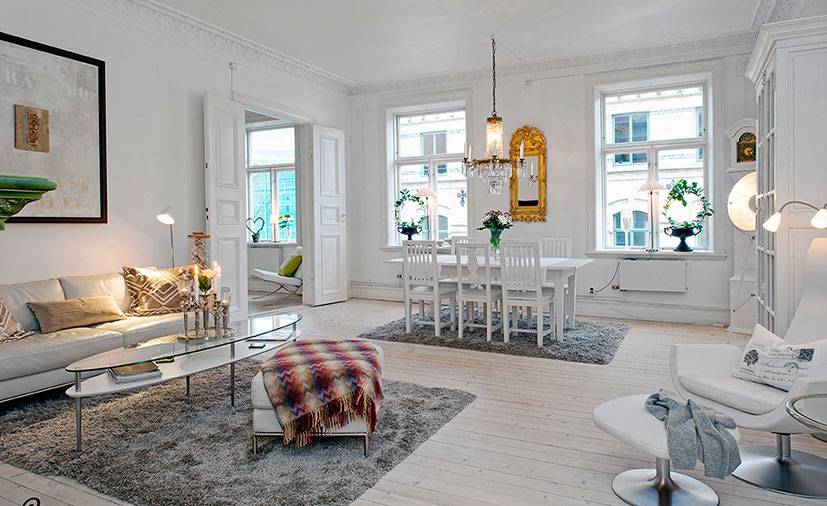 Исходя из особенностей климата, именно белый и серый цвета преобладают в скандинавских интерьерах. Светлые тона хорошо отбивают свет, рассеивают его по помещению, наполняют его. Также гамма выступает в качестве связующего звена дизайна квартиры в скандинавском стиле. Чтобы не превратить все в серую монотонность, необходимо использовать яркие акценты в виде живых цветов, панно, текстиля, картин и т.д.