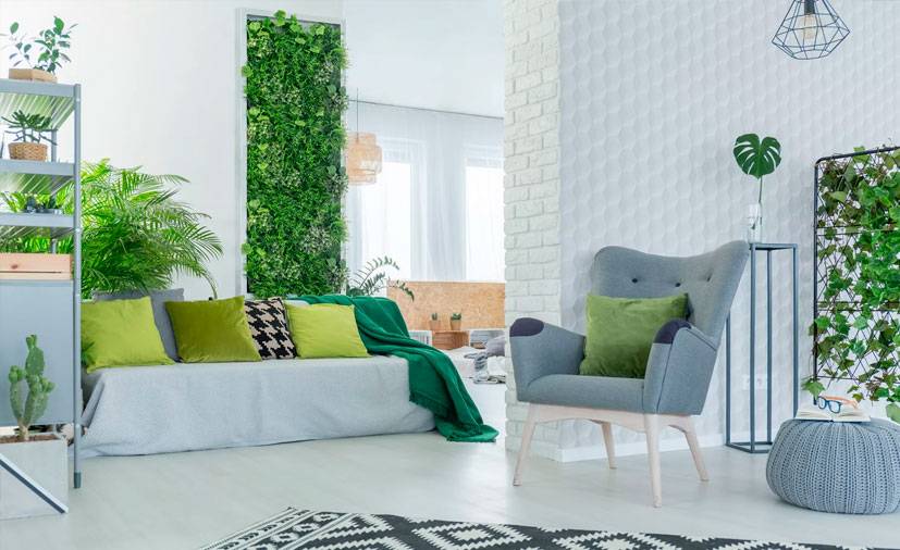 нехватка света и зелени у народов севера находит решение в следующих приемах. В интерьере обязательно используются сочные зеленые растения (возможно даже искусственные). Они могут быть большими, вроде фикусов, вьющимися по стене подобно плющу, а также небольшими зелеными кустиками обычной газонной травы. Флористические принты могут присутствовать в текстиле – занавесках, подушках, пледах, и даже в мебельной обивке. Очень часто это принты несуществующих растений – ярких, притягивающих взгляд.