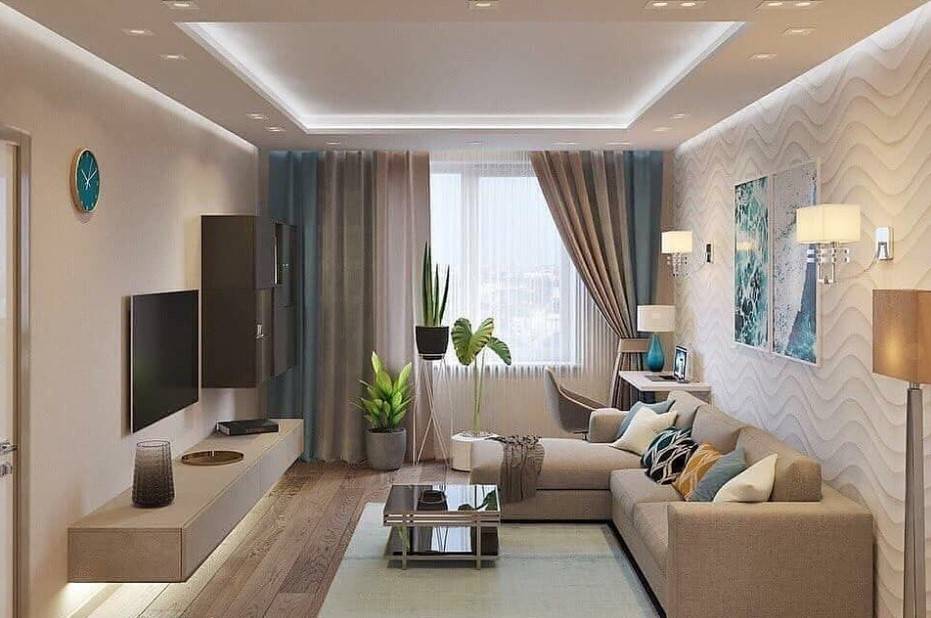 Если гостиная выполняет несколько функций, в обстановке может присутствовать обеденный или рабочий стол, комод или небольшой буфет.