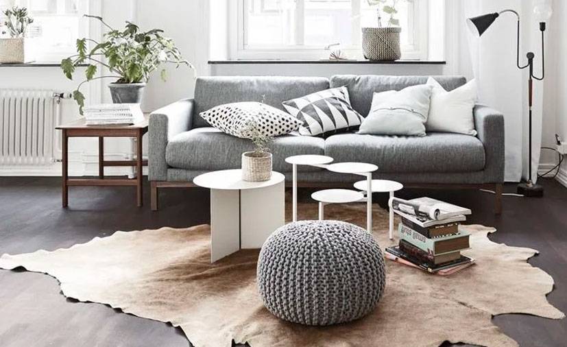 Обилие домашнего текстиля – характерная черта для скандинавского стиля интерьера. На диване может одновременно находится покрывало, плед и подушки в декоративных наволочках, при этом все элементы будут сочетаться по цвету друг с другом и другими деталями. Ткани выбираются мягкие, приятные на ощупь. Классические ковры применяются редко, выбирают модели с густым, пышным ворсом или имитацию шкур животных.
