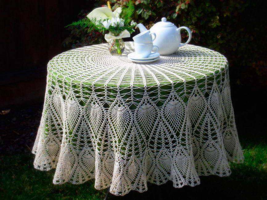 Вязаные изделия дополнят деревенский и романтический стиль, Прованс и Ландхаус. Красиво выделяется узорное полотно, застеленное сверху отреза ткани или контрастной по цвету клеенки.