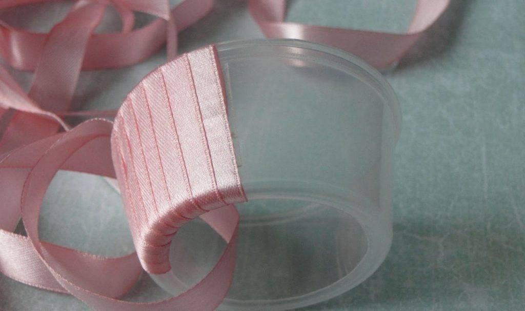 После того, как вы приклеили ткань на дно упаковки, можно приступать к декору. Сплетите из атласной ленты широкую аккуратную косичку и приклейте её к основе по всей окружности. Старайтесь клеить так, чтобы лента не сползала и не косилась в одну сторону.