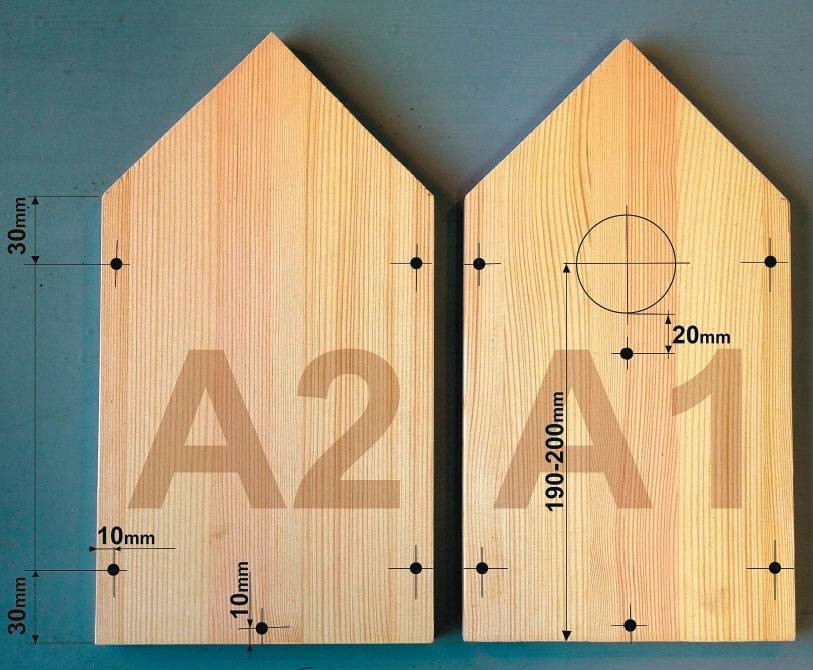 Отверстия в деталях А1 и А2 расположены одинаково. Дополнительно на передней стенке размечаем контур будущего летка (круглого окошечка, которое будет служить входом в скворечник). Диаметр летка должен быть 45–50 мм. Чуть ниже необходимо сделать отверстие для палочки-шестка. Леток должен располагаться на высоте около 200 мм от дна скворечника, чтобы птицы имели достаточную зону безопасности внутри (иначе они будут слишком доступны для врагов).