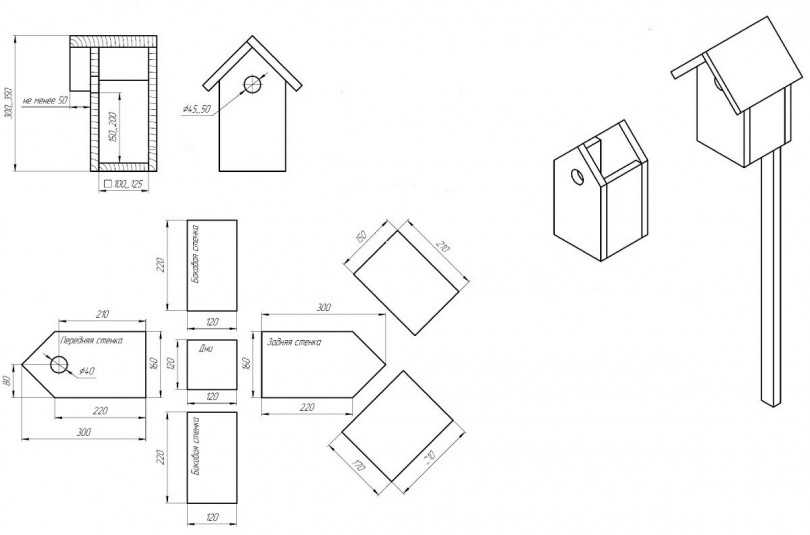 - На чертеже размеры скворечника для скворцов проставляются так, чтобы птицы чувствовали себя комфортно, но при этом хищники не могли добраться до птенцов или кладки. К естественным врагам относятся не только кошки. Сороки и другие виды крупных птиц также могут разорять гнездовье.