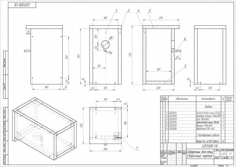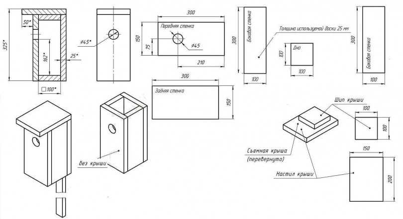 Теперь очередь эскизов скворечника, с чёткими отметками показателей каждого бруска. Сейчас благодаря интернету, можно найти уже готовые прорисовки и по ним подготовить объект. Ниже представлены типажи: