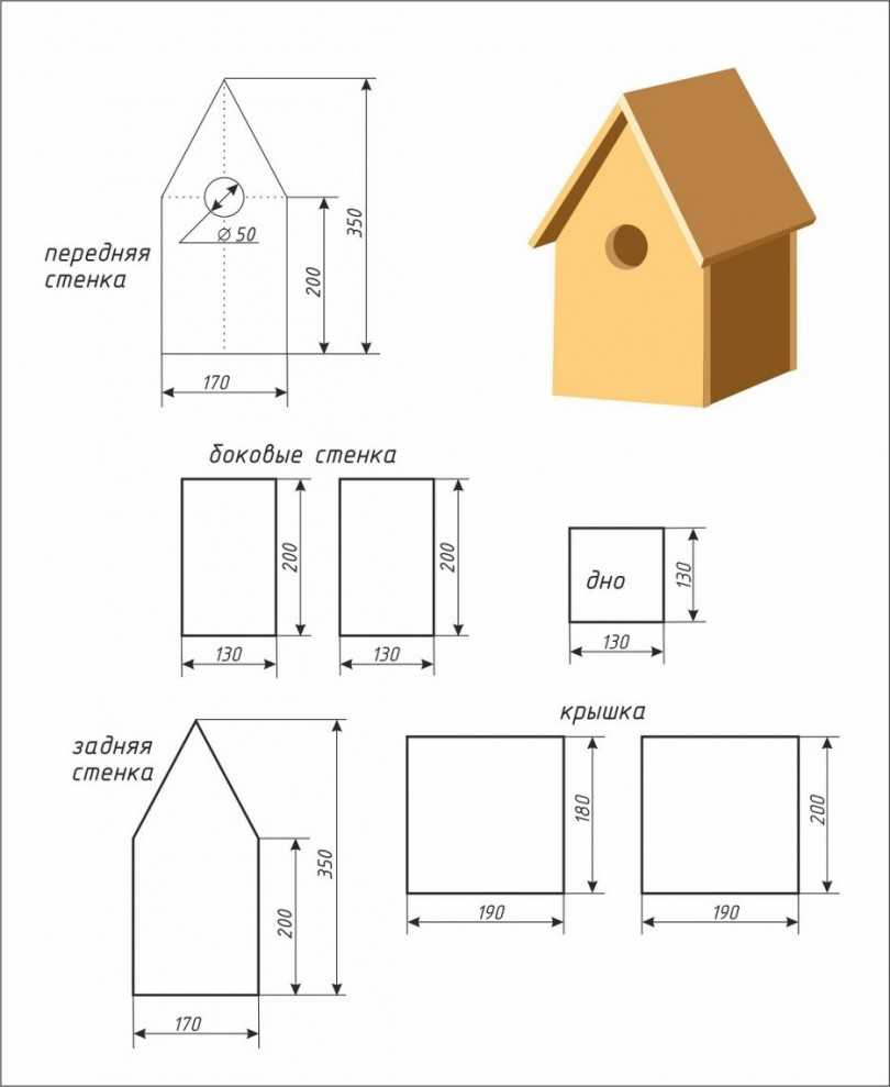 Скворечник простейшей конструкции состоит из квадратного днища со стороной 13-15 см, заготовки боков высотой 30-35 см с откосом в верхней части выпиливаются впритык по размеру днища, торцевая и задняя часть должны быть на 2-4 см шире для крепления.