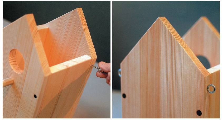 В торцы задней стенки вкручиваем по две петли (если не найдется петель, замените их обычными саморезами). За эти колечки скворечник будет крепиться к стволу дерева или стене дома.