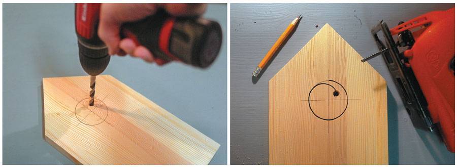 Осталось сделать окошко-леток в передней стенке А1. Для этого сначала просверлим толстым сверлом (8–10 мм) отверстие внутри контура летка для того, чтобы в него можно было продеть пилочку лобзика. Затем выпиливаем по контуру, после чего обрабатываем края наждачной бумагой.