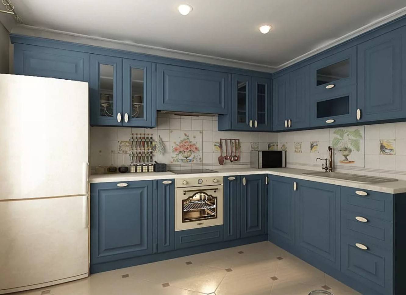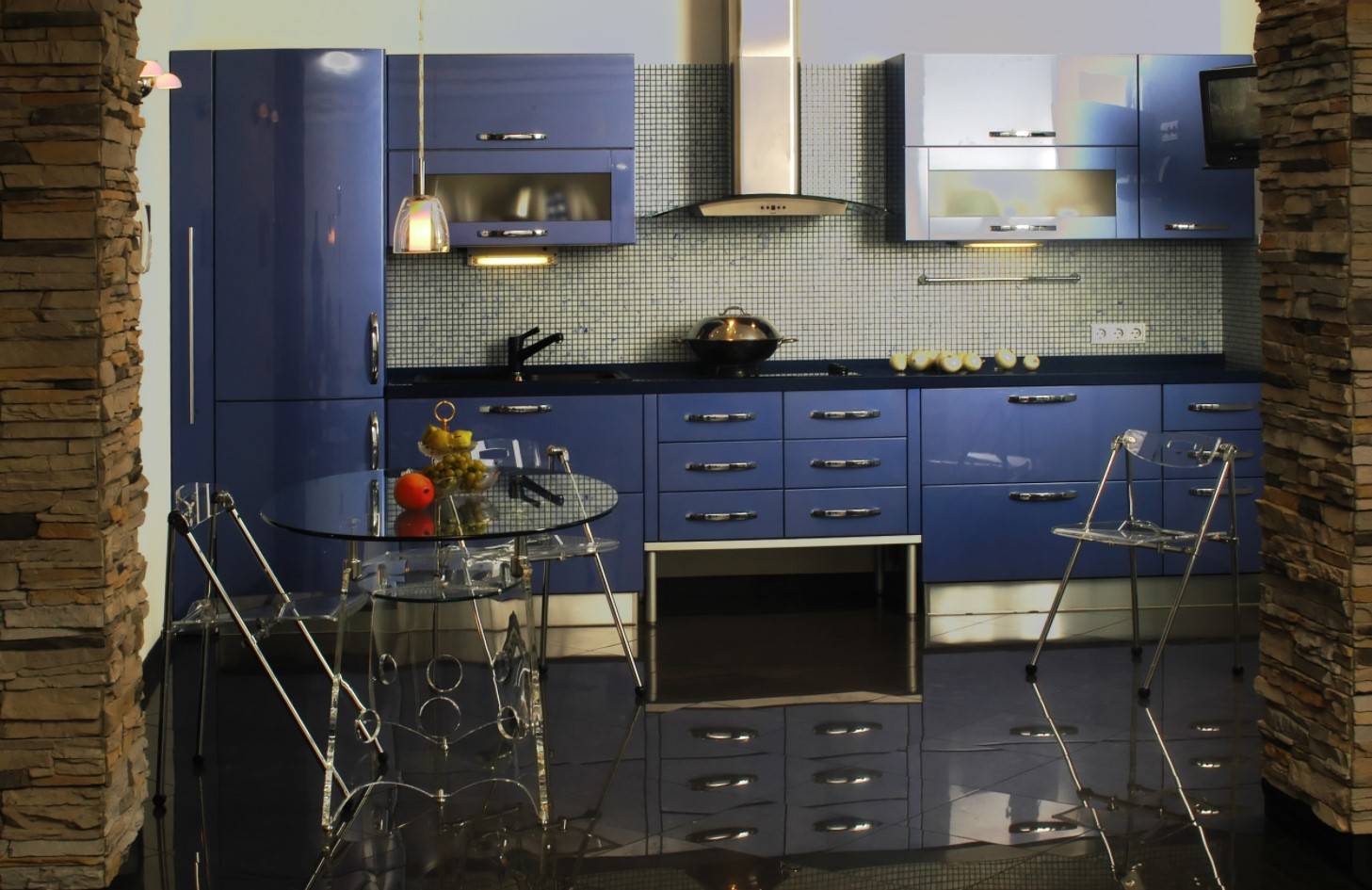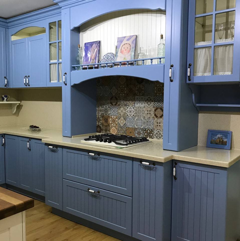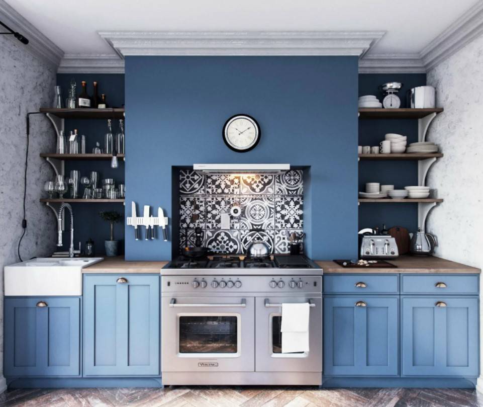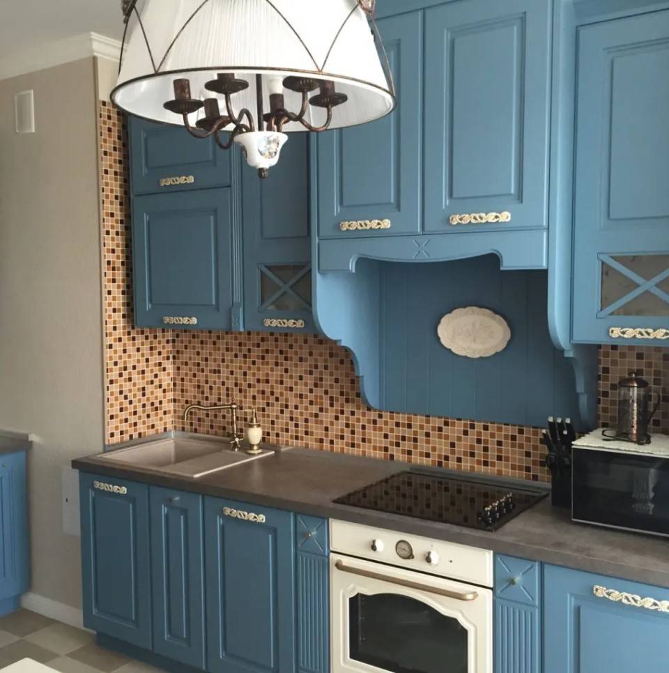 Если вам по душе незабываемый деревенский колорит, то оформите вашу кухню в стиле прованс. Стиль апеллирует именно к природным оттенкам и не приемлет синтетических элементов. Синим можно сделать гарнитур или мебель — для того, чтобы добиться эффекта старины, их обычно красят техникой браширования или кракле (в последнем случае используется специальный лак кракелюр).