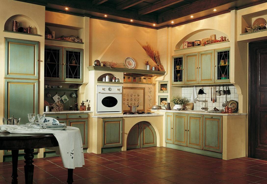 Дизайн содержит в себе черты деревенского дома или ранчо с предметами и отделкой из натуральных материалов. Кухня с добротной деревянной мебелью является визитной карточкой загородного стиля. Стены цвета травы и текстиль такого же окраса станут прекрасным фоном для гарнитура из массива. Самыми распространенными оттенками в деревенском стиле являются оливковый, мятный, иногда встречается изумрудный. Дополнением к ним служат серые или бежевые тона той же насыщенности, что и основной цвет. Помещение, оформленное в зеленой гамме, украсят плетеные кресла, глиняные горшки и вазы, текстиль из грубоватых неокрашенных нитей.