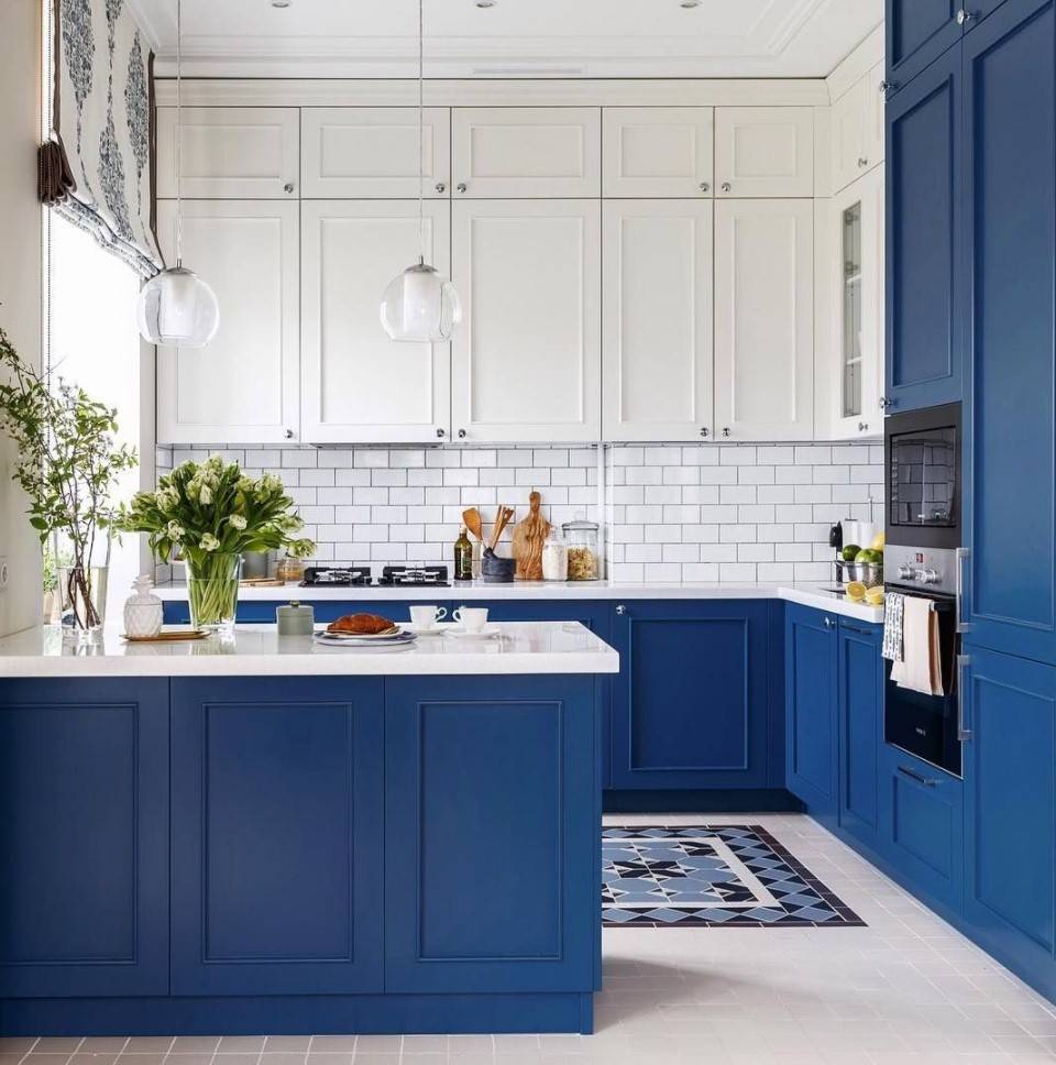 Голубой цвет получается из синего, которого разбавили белой краской. В соседстве с голубым синий становится мягче, создается игра цветов, а эффект свежести и прохлады усиливается, поэтому лучше избегать такого сочетания в дизайне «северной» кухни.