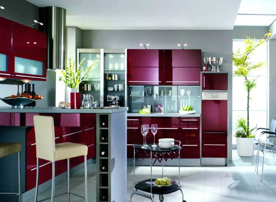 Фиолетовый. Таким оттенком окрашиваются стены в кухнях, где гарнитур и напольное покрытие выглядят намного светлее. Используют материалы с разной фактурой: обои под покраску, декоративную штукатурку, кафель.