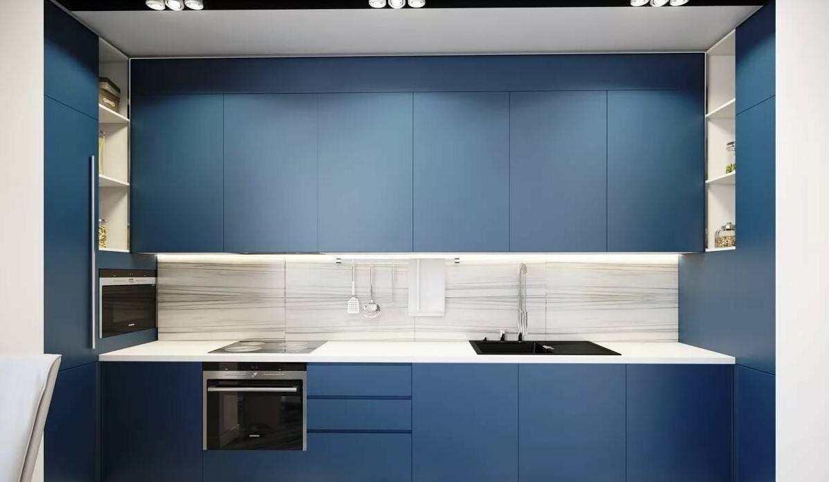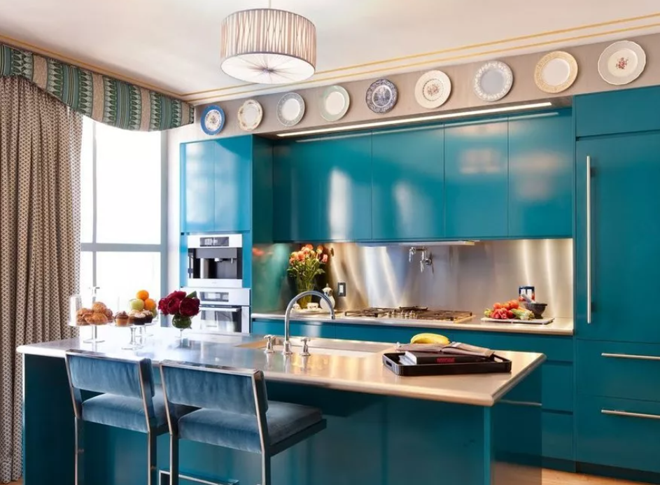 Полёт творческой мысли посетит хозяйку у плиты, если кухонные фасады будут оформлены в оттенках моря. Относясь к холодной цветовой гамме, голубой и бирюзовый не вызывают чувства голода, в отличие от тёплых оттенков.