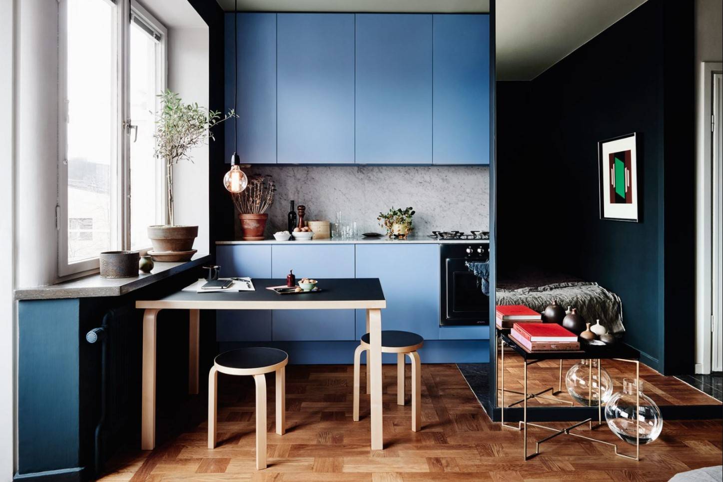 Некоторая мрачность глубокого и насыщенного синего цвета легко разбавляется парочкой-другой деталей. Например, вставками из натуральной древесины (и вновь привет, эко-стиль!).