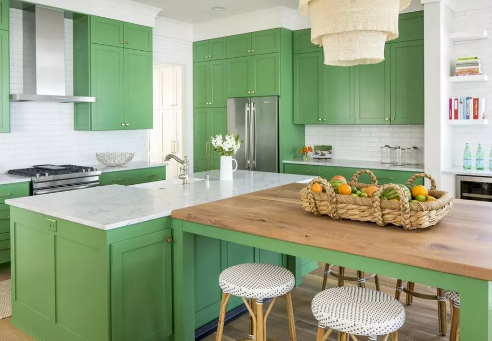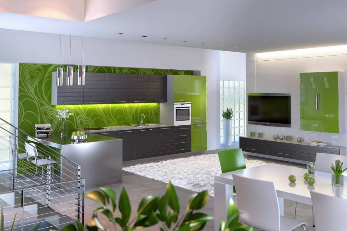 Разные оттенки зеленого. Фисташковый, оливковый, травянистый хорошо смотрятся на маленьких уютных кухнях. Если окрасить одним из них стены, то гарнитур следует выбирать заметных тонов: белого, черного, серого. На фоне зеленых стен эффектно смотрятся шкафы со стеклянными фартуками.