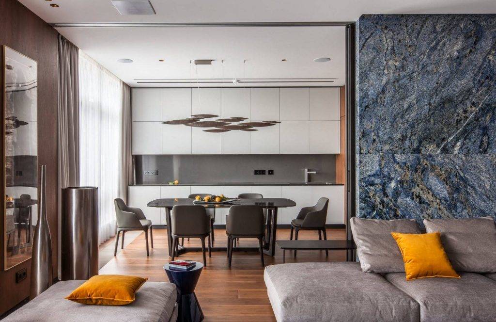 Рекомендации актуальны и для природных материалов. Например, с мраморным фартуком гармонируют пол и мебель под цвет прожилок мрамора. Гранитный фартук можно продублировать в других местах кухни в пределах 10% от общей площади.