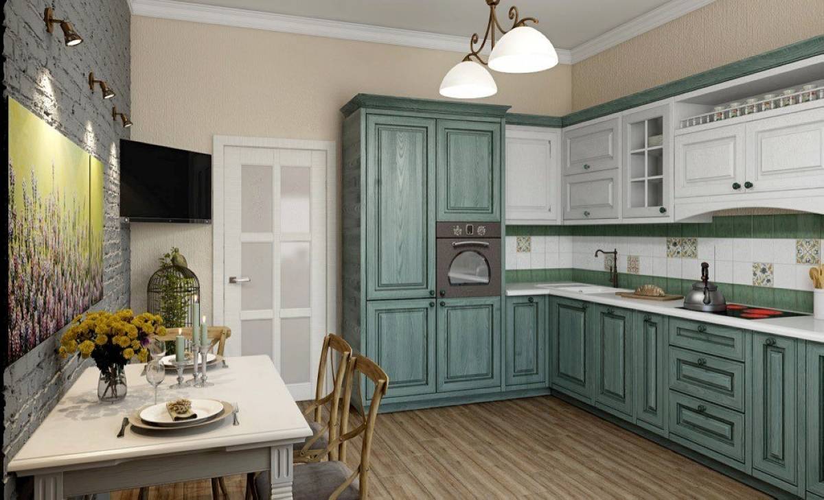 Идеальный вариант: матовый оливковый гарнитур, бежевые стены с мелкой клеткой и текстиль деревенской расцветки. Современная техника будет выделяться из общей картины, поэтому стоит выбирать винтажные приборы (имитирующие 19 столетие). Холодильник лучше спрятать за фасадами.