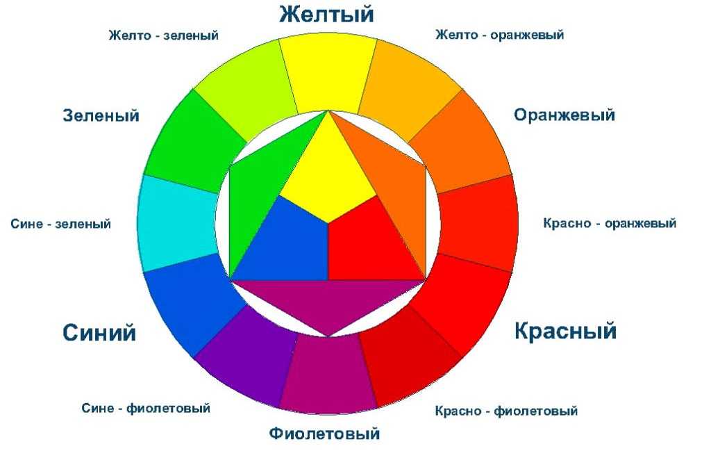 Посмотрите на графический круг. На нем видно треугольник с тремя цветами в центре круга. Это первичные цвета –желтый, красный, и синий, из которых происходят вторичные: зеленый (желтый + синий), оранжевый (красный + желтый), фиолетовый (красный + синий).
