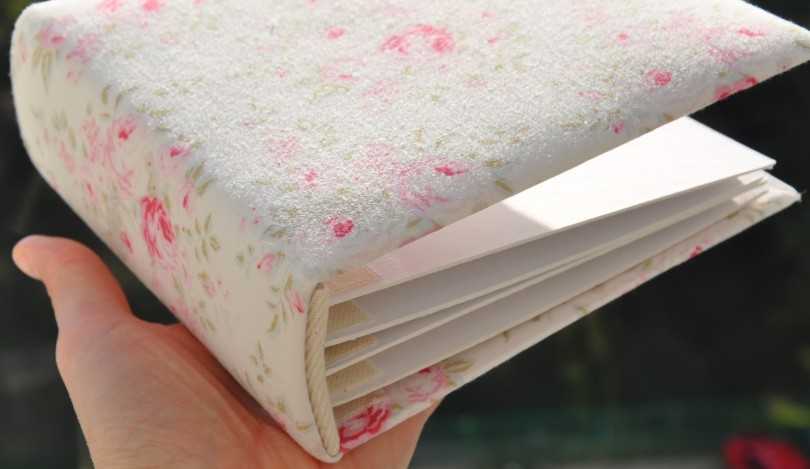 Аккуратно отрезаем переплет от старого ненужного или некрасивого альбома. Обтягиваем его выбранной тканью, закрепив с обратной стороны, украшаем. Измерив ширину корешка и прикинув, сколько листов и какого размера в него поместится, повторяем п. 1-3 из списка выше.