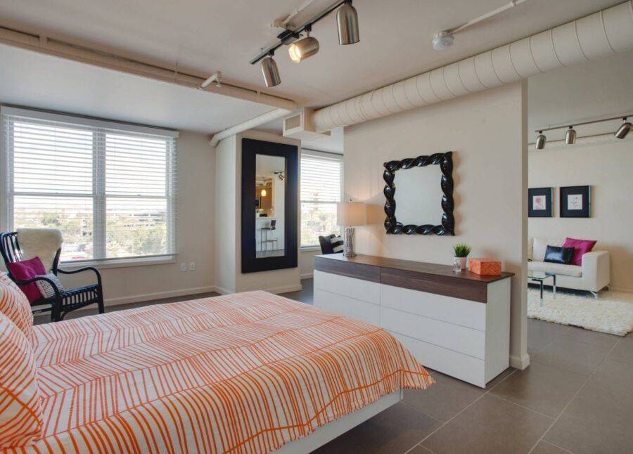Если в спальне проживает сразу 2 человека, то зонирование будет несколько сложнее. В таких условиях рекомендуется использовать диван-кровать, чтобы иметь возможность превратить спальное место в импровизированную мини-гостиную.