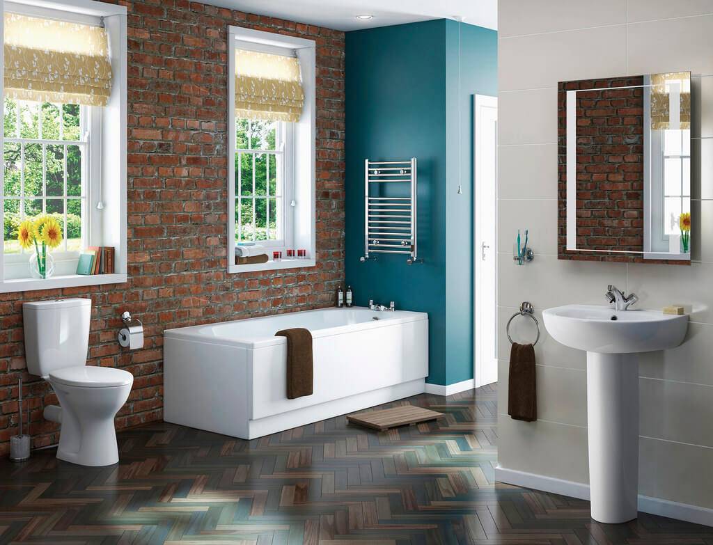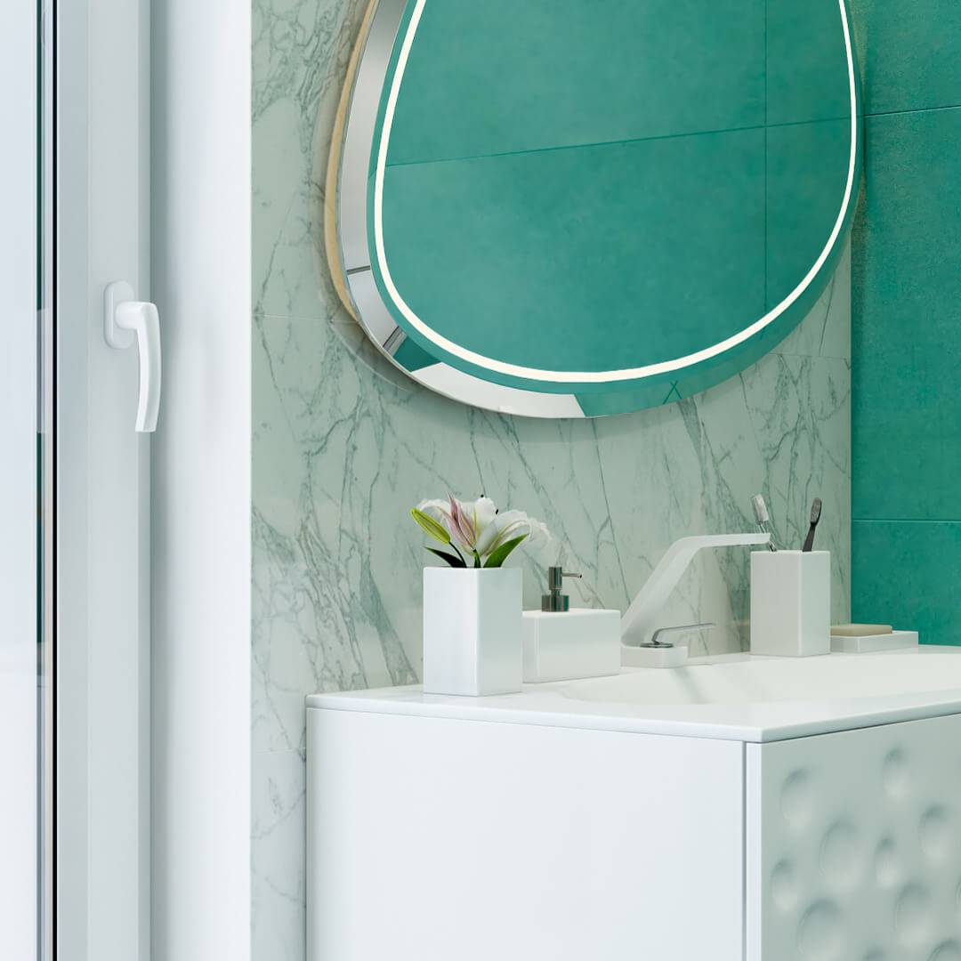 Среди отделочных материалов для ванной комнаты выбирают наиболее влагоустойчивые, легко поддающиеся уборке, так как постоянное присутствие влаги и конденсата может повлиять на эстетические свойства. Бирюзовый цвет будет прекрасно себя чувствовать в компании близких оттенков – от светло-голубого до насыщенного зеленого. Классика – сочетание с белым. Кроме этого, удачно он комбинируется с песочными, кремовыми, оранжевыми цветами. Присутствия красной и черной палитры лучше избегать или, в крайнем случае, применять более светлые их тона (розовый, серый) мелкими вкраплениями.