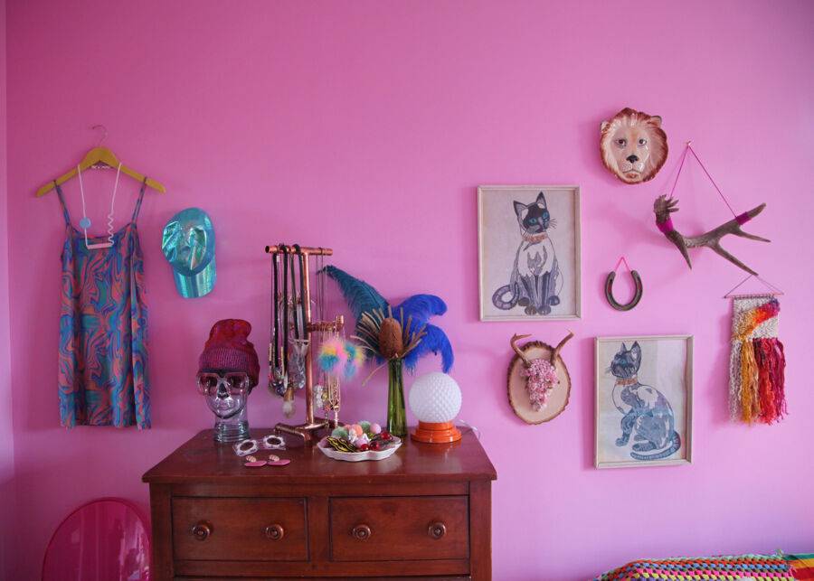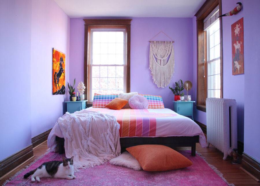 Пастельно-розовая спальня может показаться слишком «девчачьей», а вот если добавить к розовому приглушенный серый цвет, комната приобретет более строгий и универсальный вид.