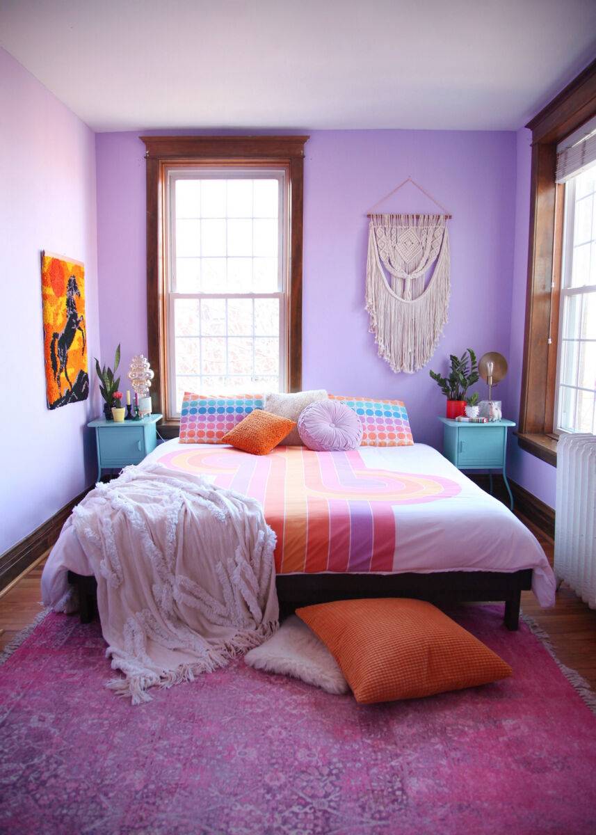 Использование спокойной цветовой гаммы. Спальня может быть выполнена в любых оттенках, однако в качестве базовых принято использовать теплые пастельные тона. Их разбавляют яркими вкраплениями: бордовым, золотистым, фиалковым.