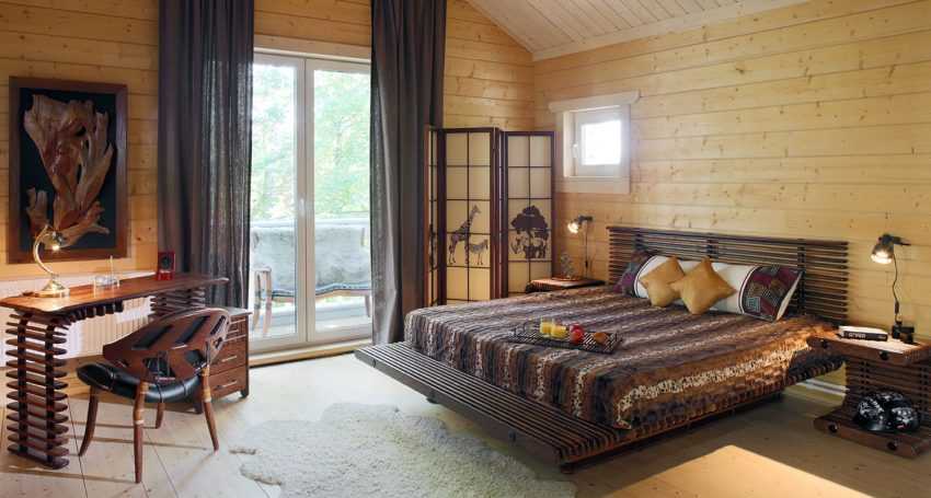 В условиях современного коттеджного домостроения и свободной планировки отличным вариантом оформления бежевой спальни станет мебель из массивного дерева и широкое ложе с элементами металлической ковки.