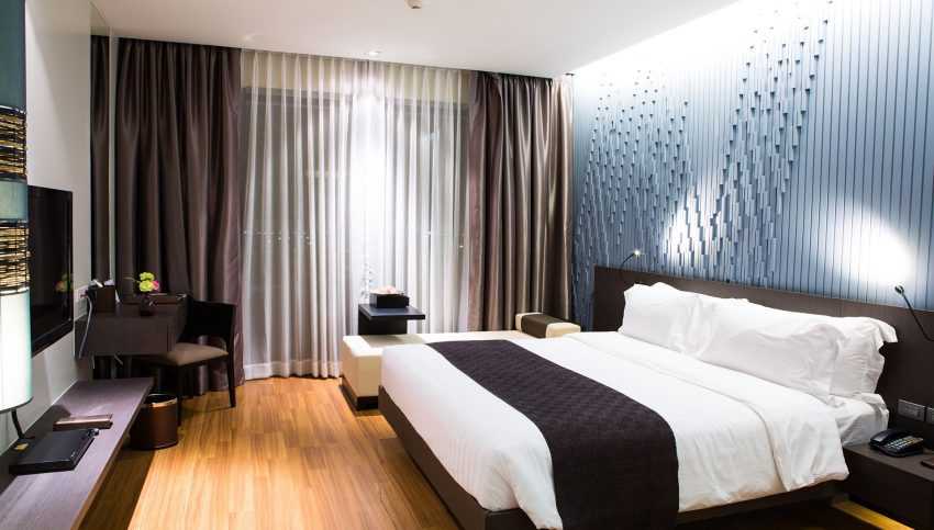 Выбирая гардины, принимайте во внимание реальную площадь спальни: если комната просторная, помимо бежевого и белоснежного можно применять темные тона