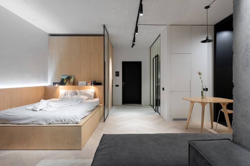 В случае квартир с высокими потолками стоит рассмотреть мезонин. Это идеальное решение, как использовать доступ к потолку, и, таким образом, сохранить полезное пространство студии. Для этой цели вы можете выбрать двухъярусную кровать, верхней частью которой будет ваша спальня, а пространство под ней можно расположить любым способом. Другой способ — построить мезонин и поставить отдельную кровать на временный пол или просто матрас, если комната недостаточно высока. В этом случае, однако, вы должны помнить о правильной балюстраде, которая защитит вас от падения с высоты.