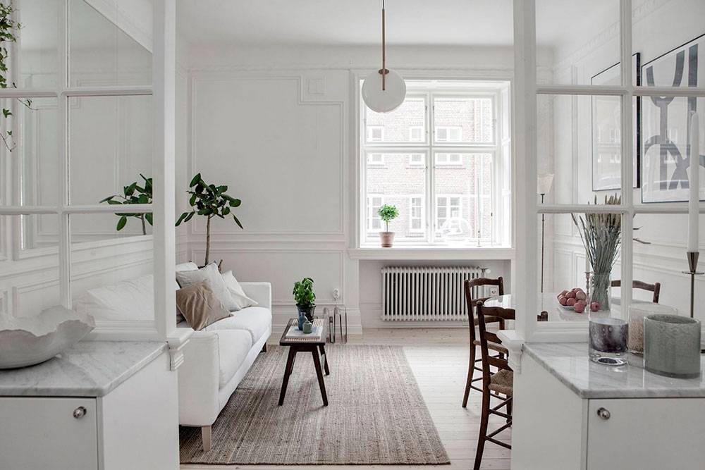 Мы говорили о том, как скандинавский стиль будет отличным выбором для дизайна однокомнатной квартиры, и это не просто так. Самый простой способ создать визуально более просторную квартиру-это привлечь естественное освещение. Да, вы можете добавить встроенное освещение и акцентные лампы. Но абсолютно ничто не работает так же хорошо, как естественный свет.