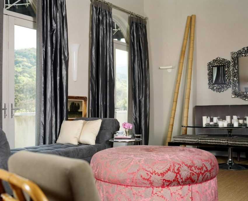 Текстильные принадлежности – покрывала, накидки и шторы часто используют в затемненном сером оттенке. Также они могут быть яркого теплого тона: розовые, сиреневые, лиловые. В оформлении окна участвуют тюли, римские или рулонные шторы, ночные портьеры. Навешиваются такие модели по-разному в виде ламбрекенов, подшитых или подвернутых краев, а также традиционными глубокими волнами.
