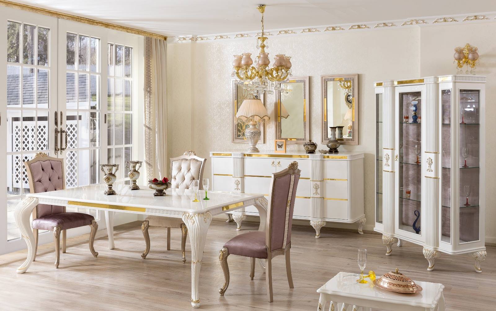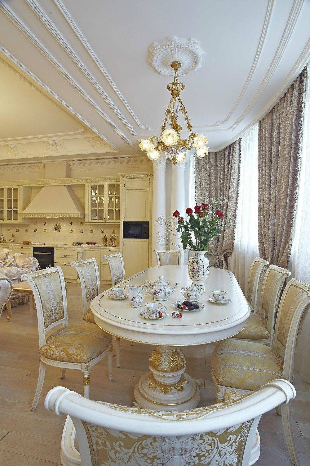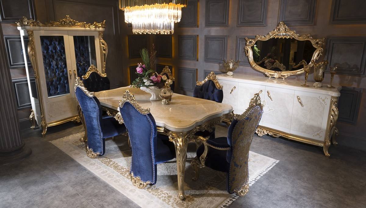 Мебель для кухни покрывается лаком или перламутром, инкрустируется слоновой костью или позолотой, а также украшается резьбой по дереву. Как правило, используется золоченая фурнитура. Приветствуются серванты со стеклянными дверцами. Купите массивный большой деревянный стол круглой формы, который станет главным акцентом на кухне. Стулья должны быть с дорогой обивкой и на резных изогнутых ножках.