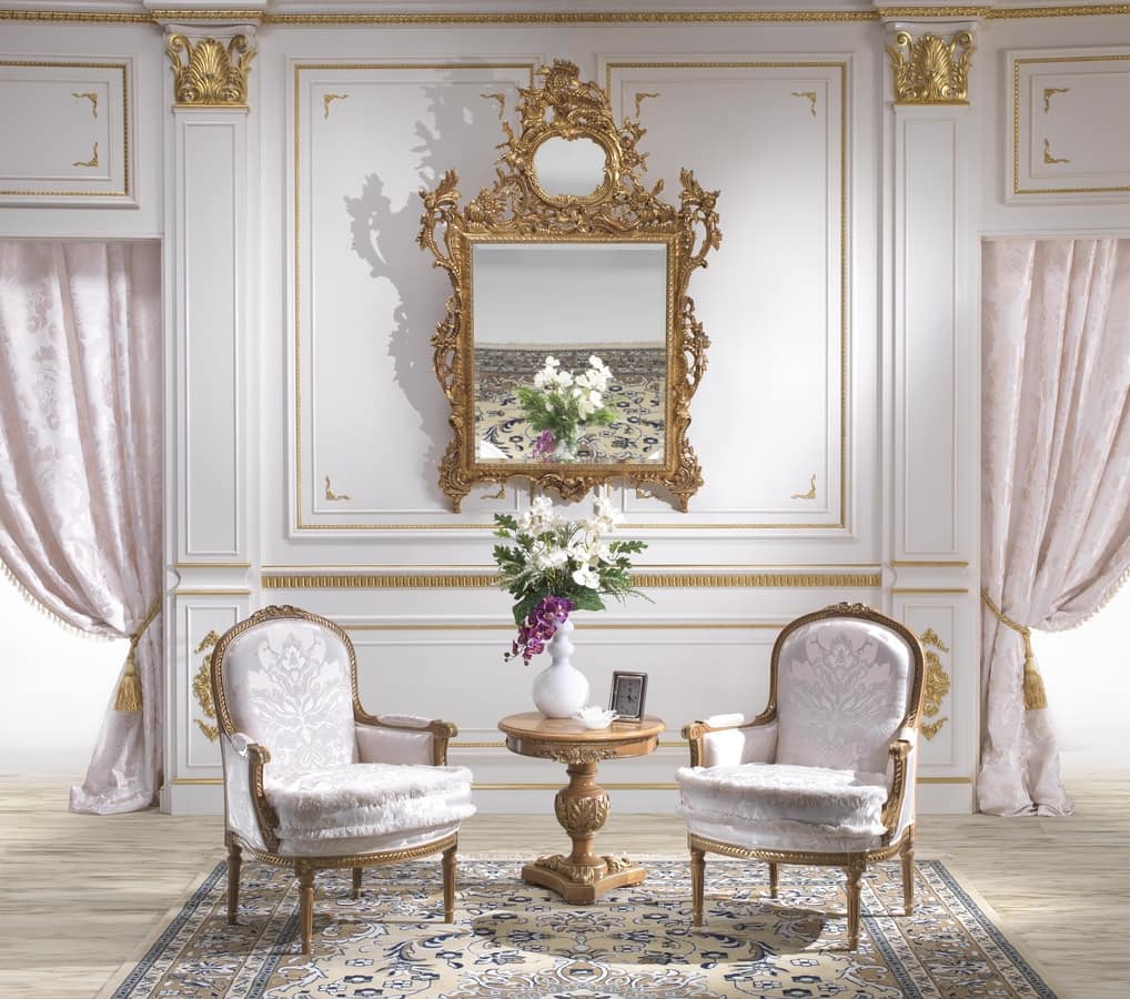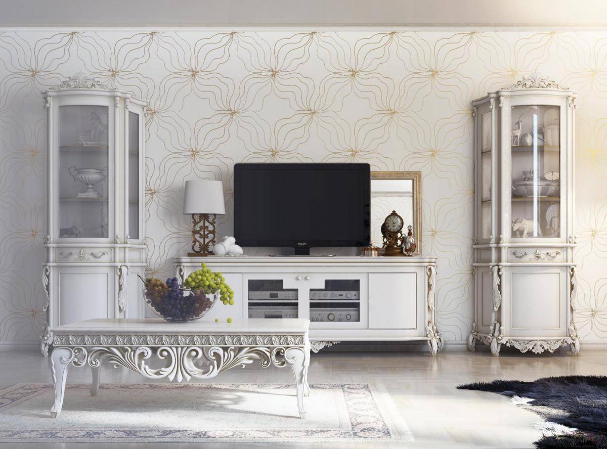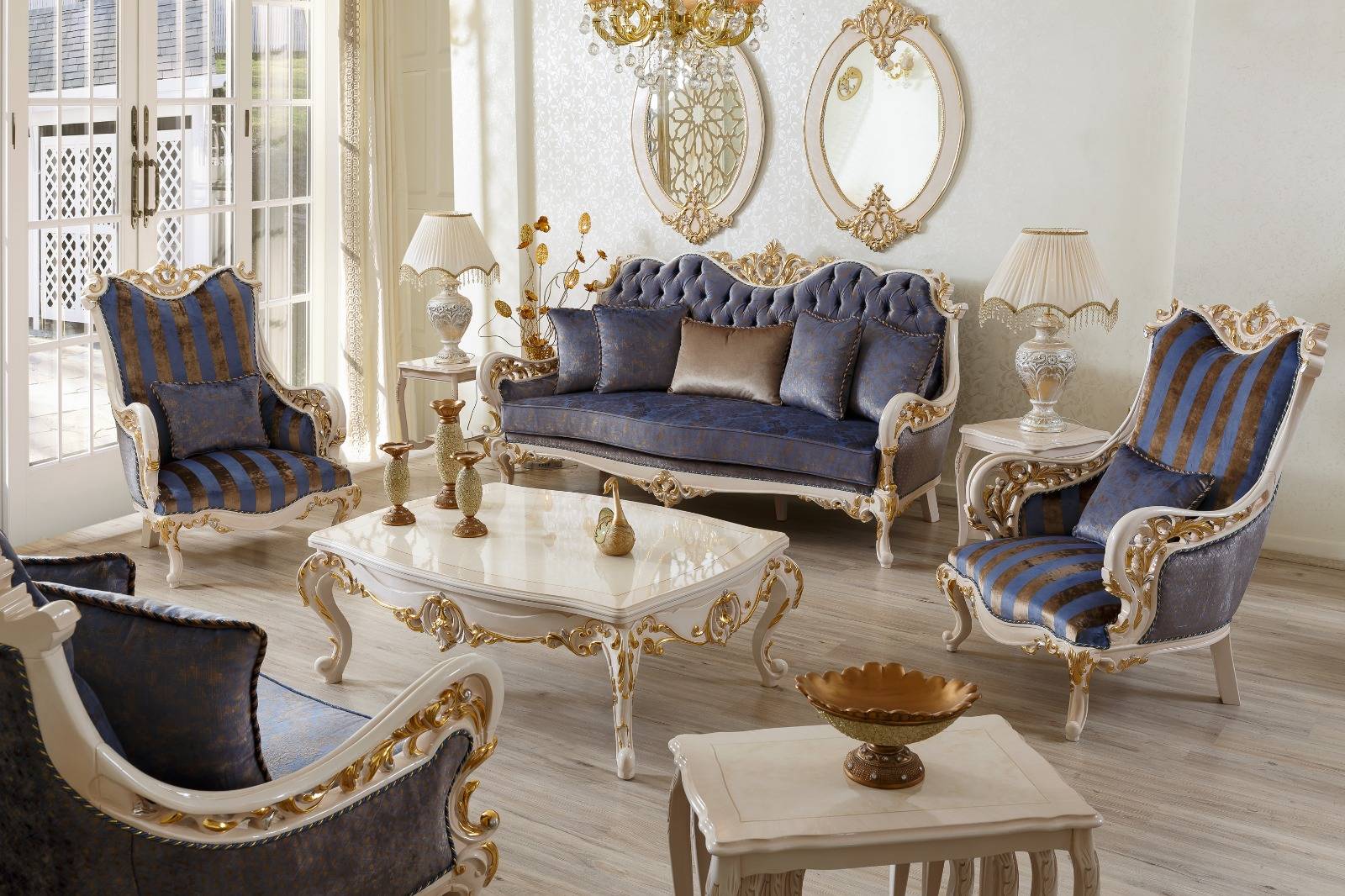 Мягкую мебель украшают обивкой из дорогих тканей. Диваны и кресла дополняют подушками. Мебельным декором могут служить кисточки или бахрома. Текстиль часто покрыт позолоченным узором, изображающим цветочный мотив. Ножки мебели вытянутые, немного изогнутые по плавным линиям. Спинки мягкой мебели высокие. Каркас делают из дерева – это натуральные дорогие сорта, хорошо поддающиеся резьбе. Имитация допустима, но ДСП часто отличается визуально. Цвет мебельного каркаса должен гармонировать с основным тоном комнаты – светлым или темным.