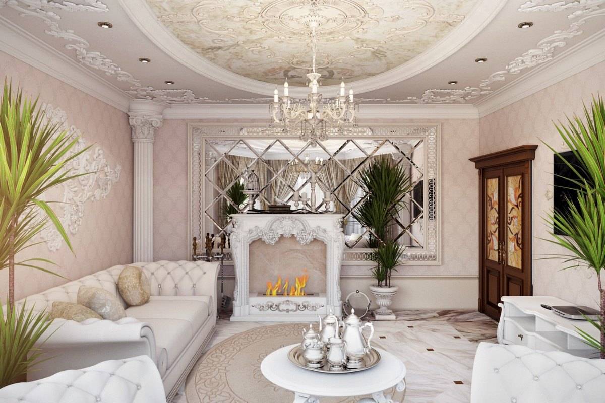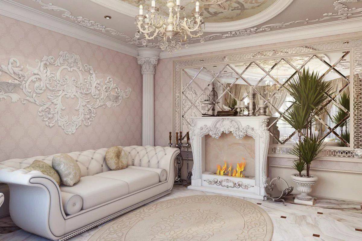 Камин и колонны (или хотя бы одна) поддерживают общую атмосферу торжественности. Классическая барочная обстановка не обходится без колонн, украшенных мрамором или декоративной штукатуркой. Оформить деталь обстановки можно камнем или его имитацией. Но когда размер комнаты не позволяет, имитацию колонн делают из лепнины.