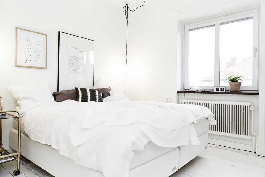 Популярна спальня в белом исполнении. К подобному решению прекрасно подойдут любые предметы меблировки и декора, фактуры прочих отделочных материалов.