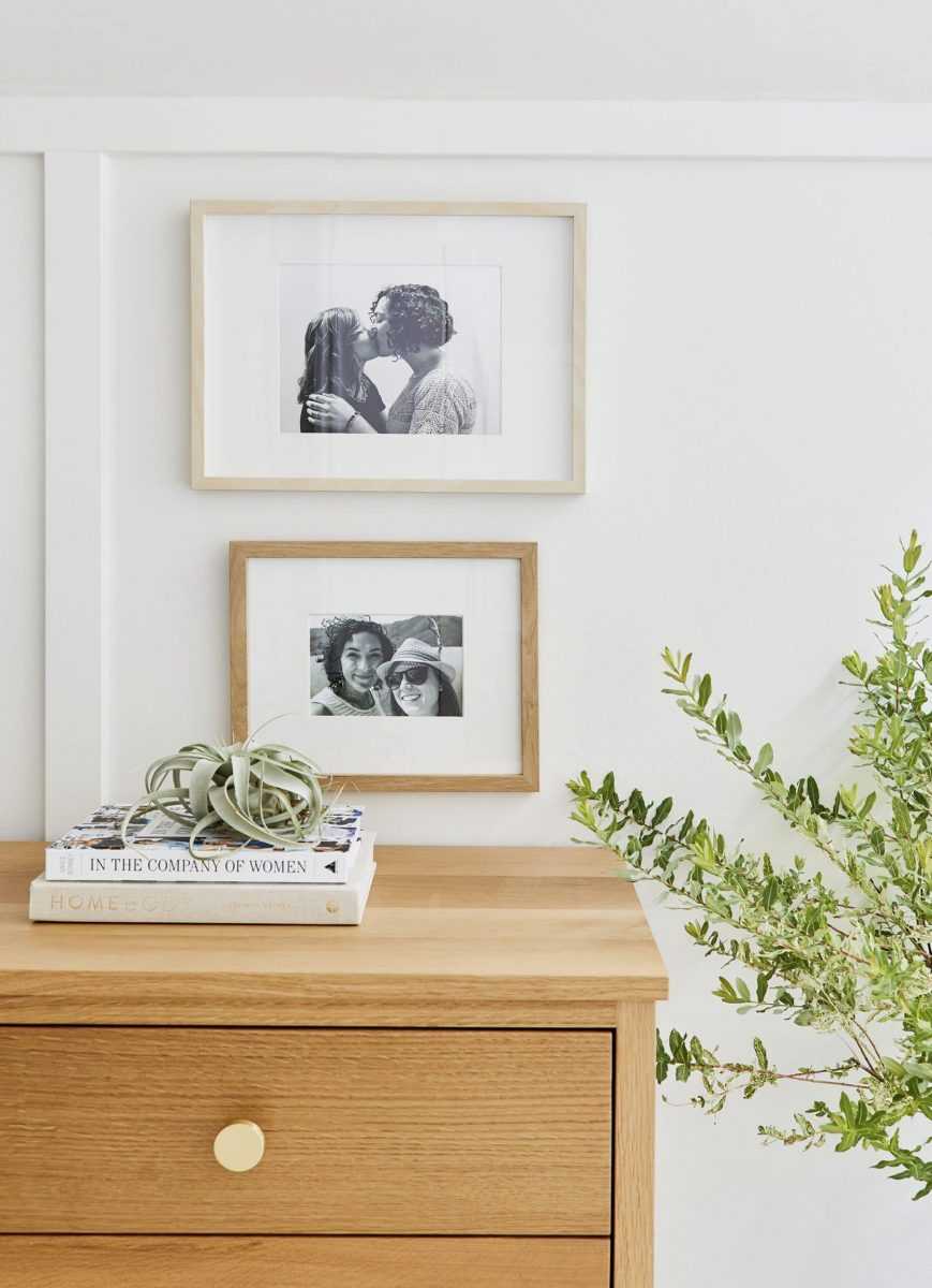 Гостиная стена которой оформлена черно-белыми фотографиями, а мебель имеет необычные формы.