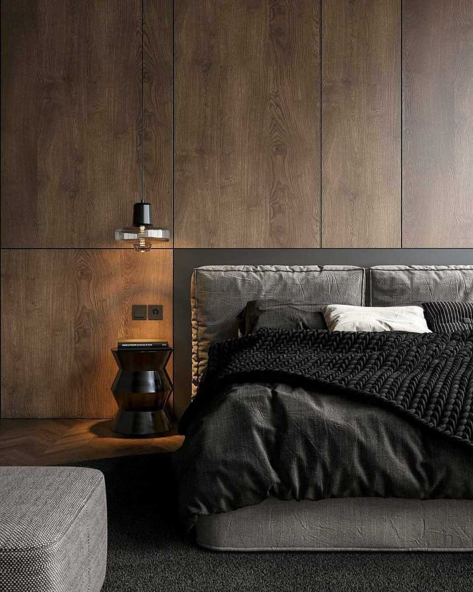Черная отделка панелями, черная кровать подчеркивают коричневый цвет паркетаИсточник mir-s3-cdn-cf.behance.net
