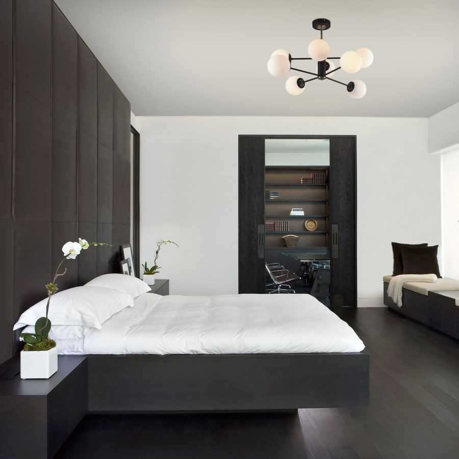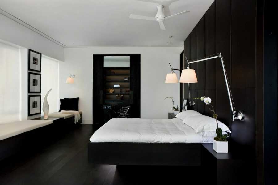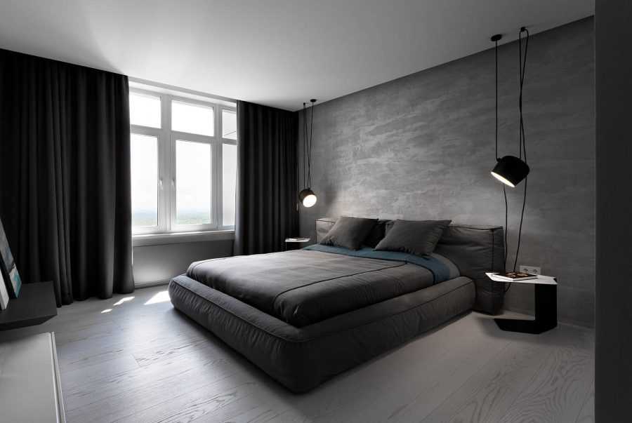 Интересны черно-белые минималистские спальни. Другой вариант – комбинирование белого и серого, при этом черный вводится акцентно. Можно скомбинировать серый и черный, разбавив его белым.