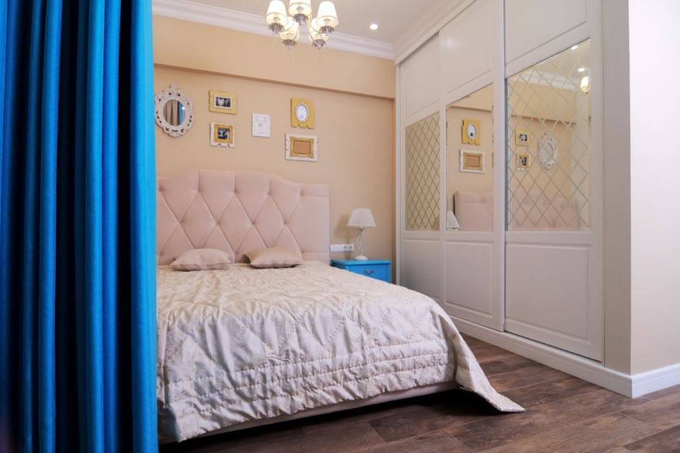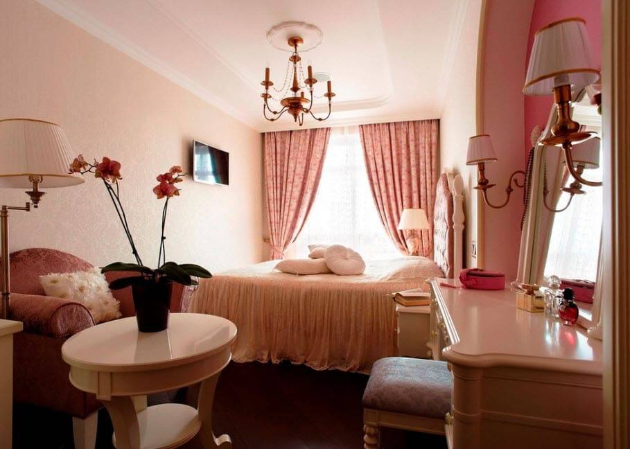 Узкая небольшая спальня. Ее можно оформить в стиле прованс, не загромождая пространство лишними предметами. Грамотно установленная мебель позволяет сэкономить площадь комнаты и осуществить зонирование. Чтобы откорректировать форму помещения, необходимо выполнить игру цветами и сделать монтаж многоуровневого потолка. Стены лучше всего обшить вагонкой – они станут роскошным фоном для декора.