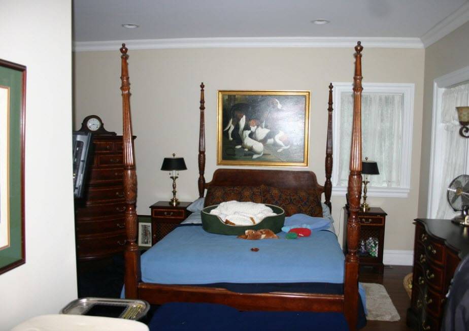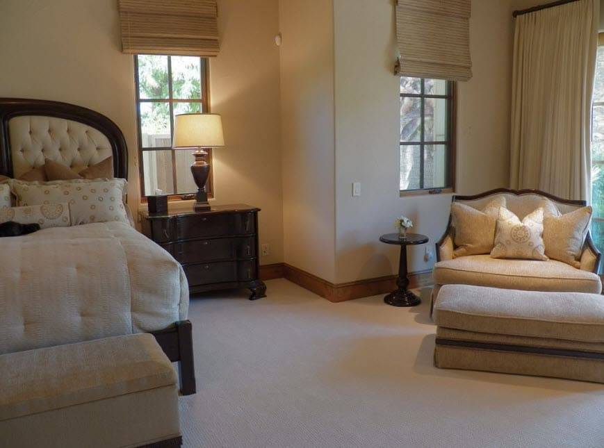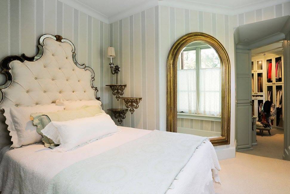 Вам понадобится большая кровать, желательно с резными спинками и ножками из цельного массива дерева дорогих сортов, прикроватные тумбочки, комод, шкафы, туалетный столик, обилие зеркал и пуфов, настольных ламп и торшеров.