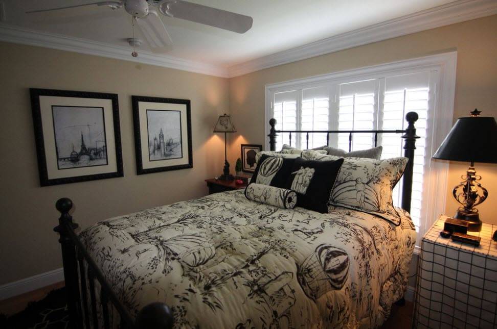 Дизайн спального Прованса для мужчины в полноте лет предполагает скудные декоративные элементы, практичность и функциональность предметов интерьера в светлых тонах. Для оштукатуренных стен подойдут молочного оттенка обои на бумажной основе или побелка водоэмульсионными составами.