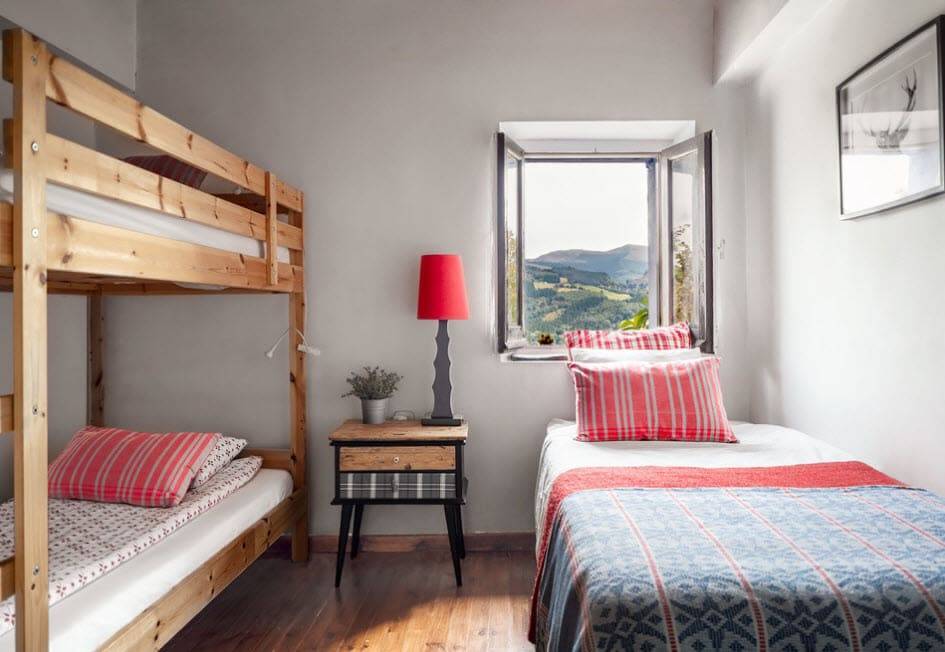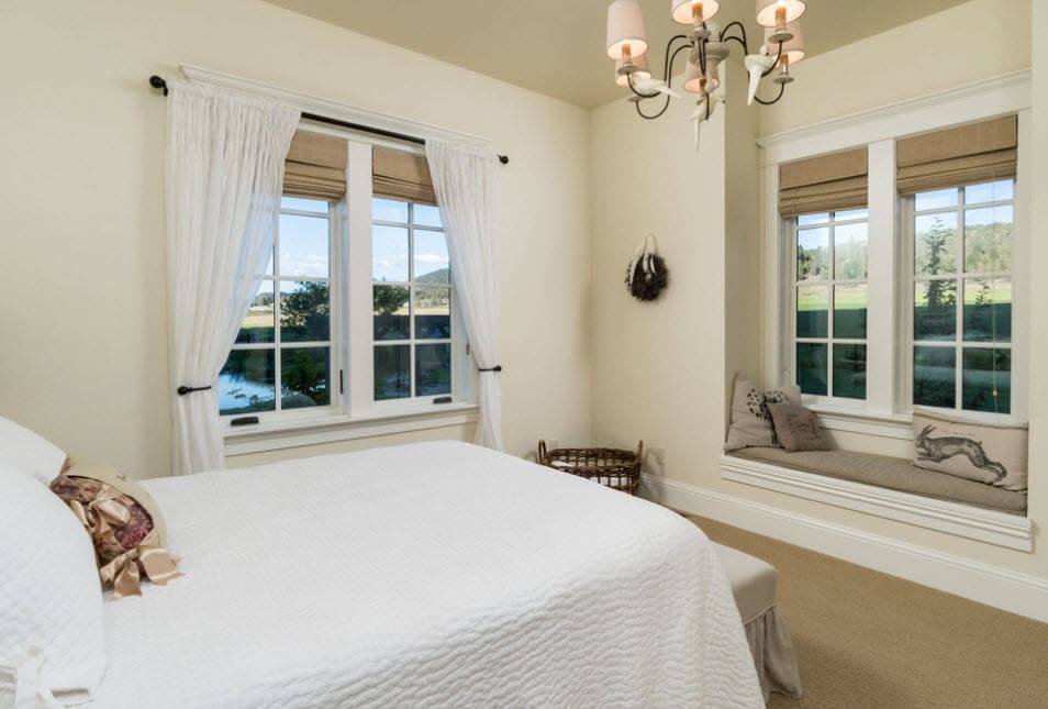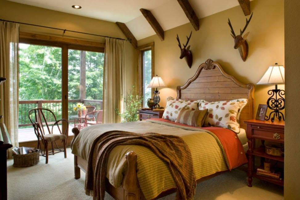 Стиль шале — олицетворение охотничьего домика со шкурками животных, чучелами и другими атрибутами успешного охотника. Интерьер спальни в стиле шале может быть очень простым в смысле мебели и содержать в себе только кровать и тумбочку. Он простой и одновременно очень функциональный.