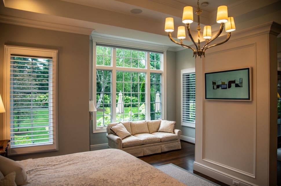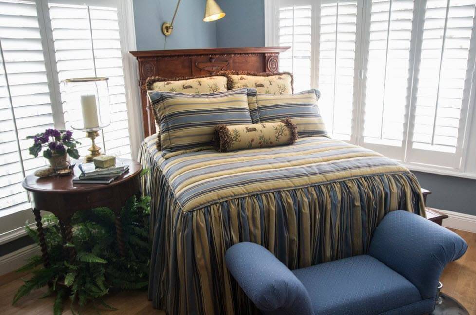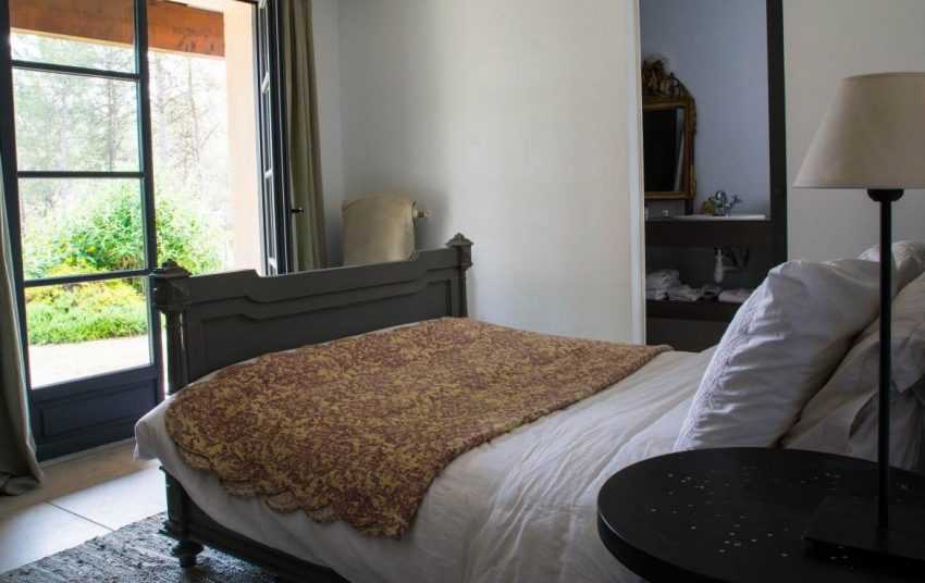 Нередко в прованской спальне отсутствуют карнизы с занавесями и тюлем, их с успехом заменяют жалюзи из натуральных материалов: матерчатые или деревянные. Это ещё одна особенность «Прованса».
